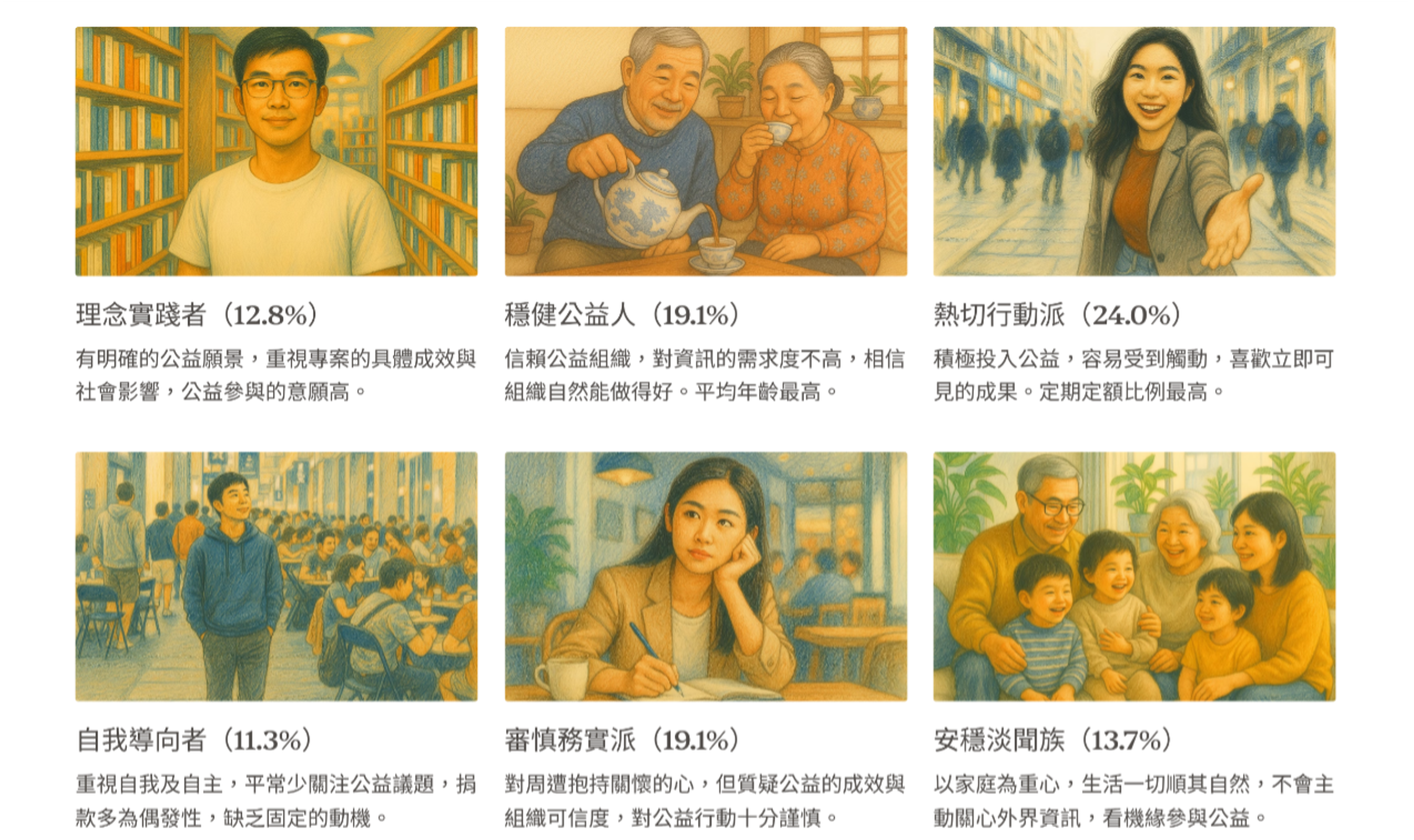 理念實踐者追求「專業信任」,需要看到能力與成效的具體證據;穩健公益人依賴「關係信任」,透過長期與組織互動建立穩固信心;熱切行動派重視「體驗信任」,從便利性與即時回饋判斷可信度;審慎務實派要求「證據信任」,必須親眼見證組織的實際作為;自我導向者依賴「感受信任」,更多從內在共鳴與直覺來判斷;安穩淡聞族偏好「熟人信任」,透過社交網絡的推薦建立信心。